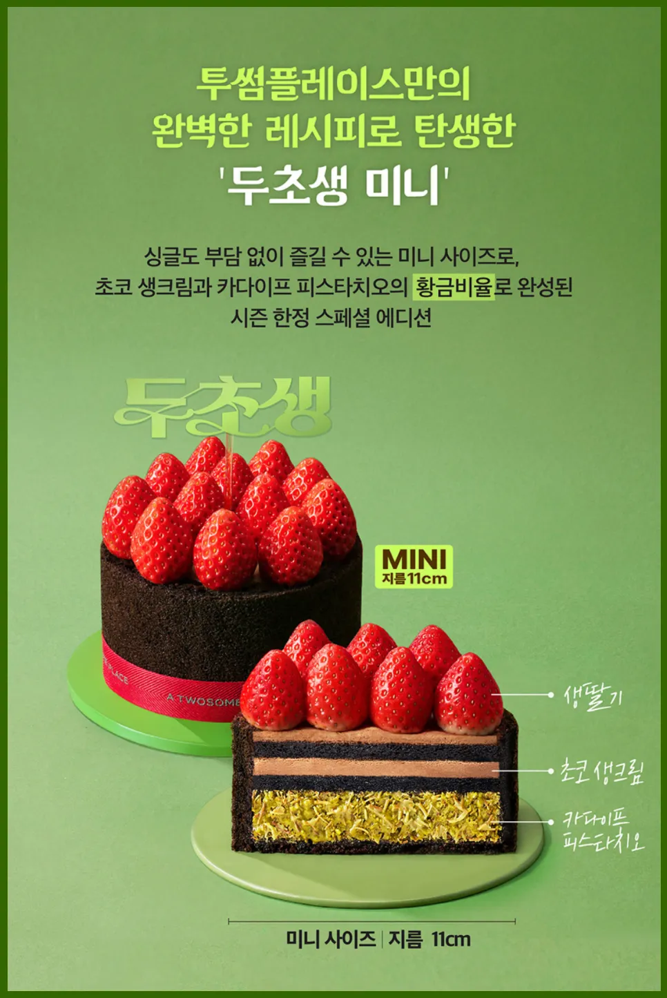 | 두초생 미니 | 11cm | 카다이프 + 피스타치오 + 초코생크림 + 생딸기 | 29,000원 |
