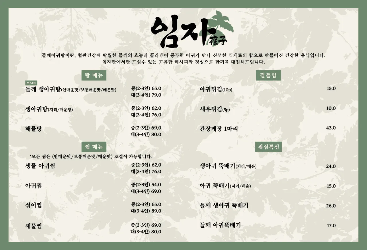 색다른 맛을 원하신다면 들깨 생아귀탕(26,000원)을 추천합니다. 담백한 아귀와 구수한 들깨가 어우러져 한 끼 식사만으로도 완벽한 보양 효과를 경험할 수 있습니다.