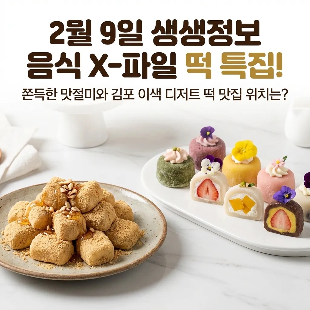2026년 2월 9일 생생정보 코너에서는 우리 선조들이 즐겨 먹던 전통 별식인 '떡'의 진화를 다루었습니다. 인천 부평의 전통 강자 '성심떡집'과 김포의 떠오르는 떡 디저트 명소 '방긋시루'가 소개