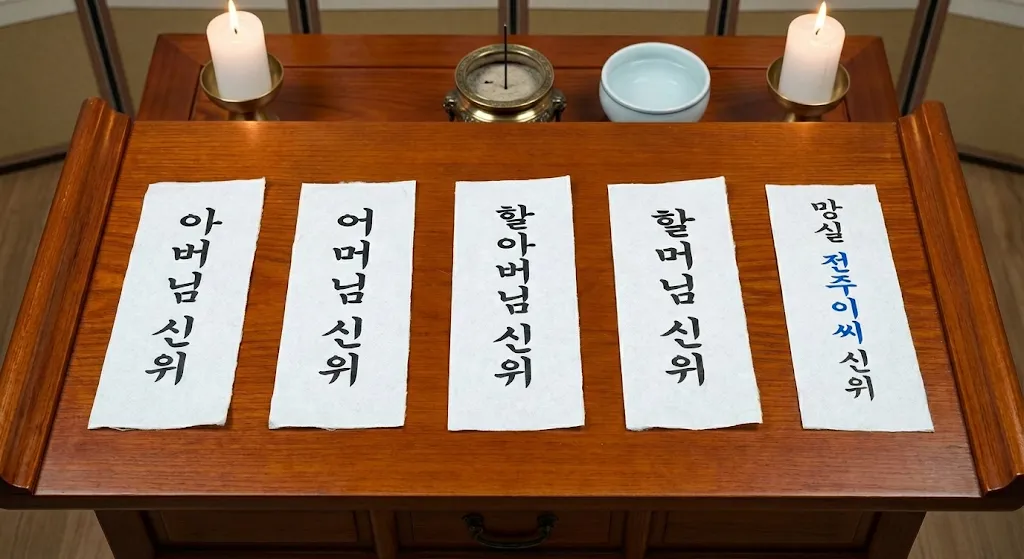 격식을 중시하는 가문에서 사용하는 전통 방식입니다. '관계 - 직위 - 이름 - 신위' 순으로 작성합니다.