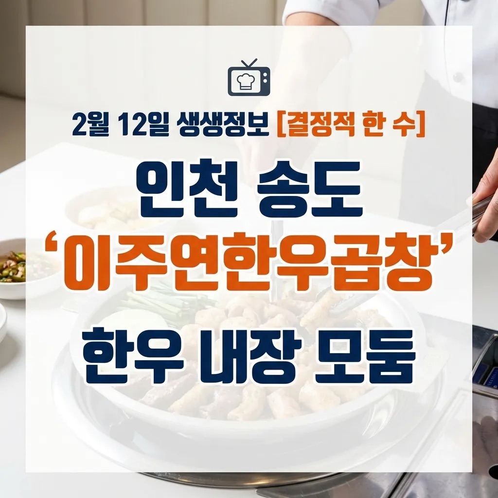 2026년 2월 12일, KBS 2TV 생생정보 '결정적 한 수' 코너가 선택한 미식의 현장은 인천 송도의 핫플레이스 '이주연한우곱창'입니다. 이곳은 한우 내장 특유의 풍미를 극대화하면서도 잡내를 완벽하게 제거한 '한우 내장 모둠'으로 곱창 마니아들 사이에서 '인생 맛집'이라 불리는 곳인데요. 달인의 섬세한 손길로 탄생한 고소한 곱창의 세계와 방문 전 필수 체크리스트를 안내해 드립니다.
