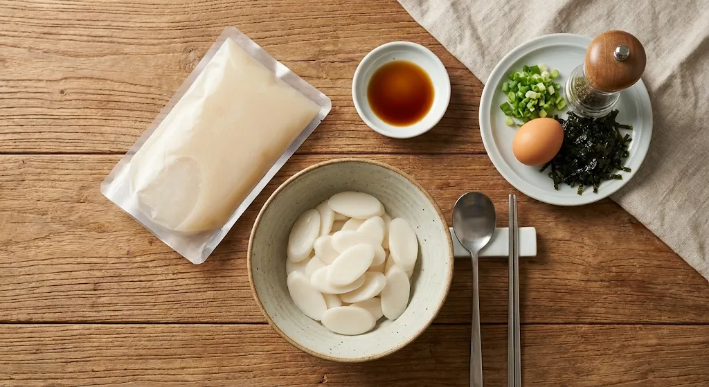 - 기본 재료: 떡국 떡 1공기(약 200g), 시판 사골 육수 1팩(500ml)