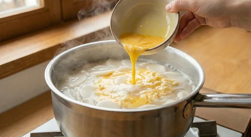 - 달걀물 두르기: 떡이 떠오르면 중불로 줄이고, 푼 달걀을 원을 그리며 부어줍니다. (※ 바로 젓지 말고 10초 기다리기!)