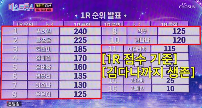 | 10위 | 김다나 | 120점 | 2라운드 개인전 대역전극 예고 |