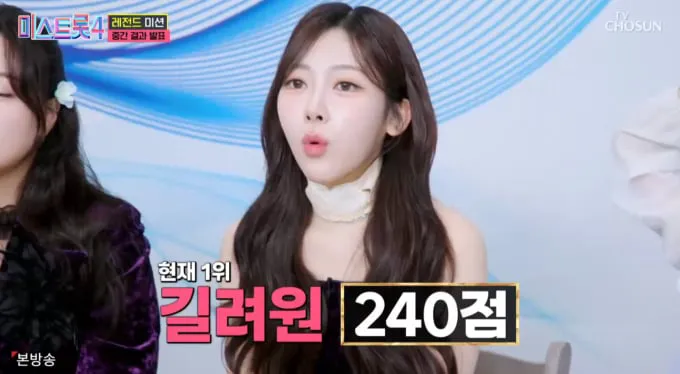 길려원은 레전드 최진희의 '미련 때문에'를 선곡해 마스터 140점, 레전드 60점, 국민 대표단 40점을 모두 가져가며 총 240점을 획득했습니다. 압도적인 보컬 실력과 감정 표현이 싹쓸이 점수의 핵심이었습니다.