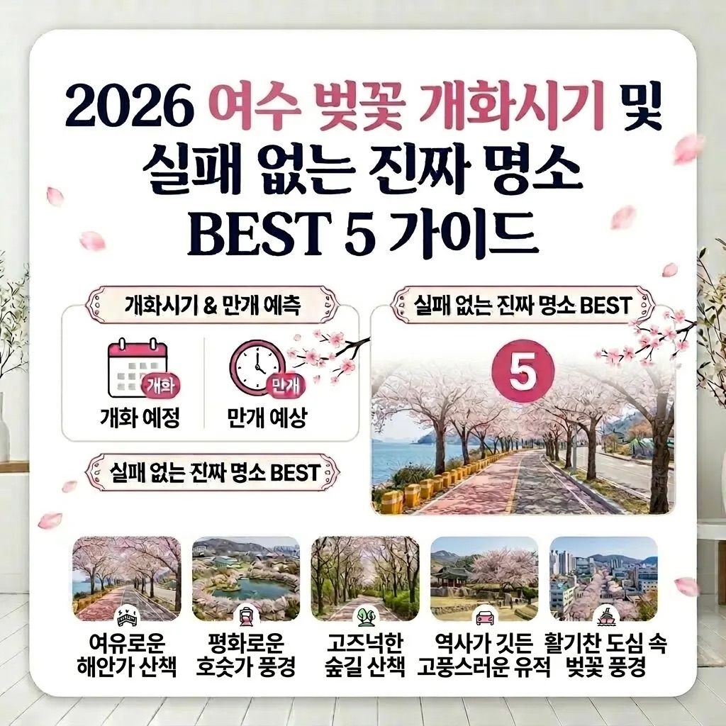 '여수 밤바다'의 낭만이 분홍빛 설렘으로 물드는 계절이 돌아왔습니다. 2026년 여수의 벚꽃은 3월 29일경 첫 꽃망울을 터뜨려, 4월 5일 전후로 화려한 절정을 이룰 전망입니다. 푸른 바다와 연분홍 꽃물결이 만나는 여수만의 독보적인 벚꽃 명소 5곳과 실패 없는 여행 가이드를 정리해 드립니다.