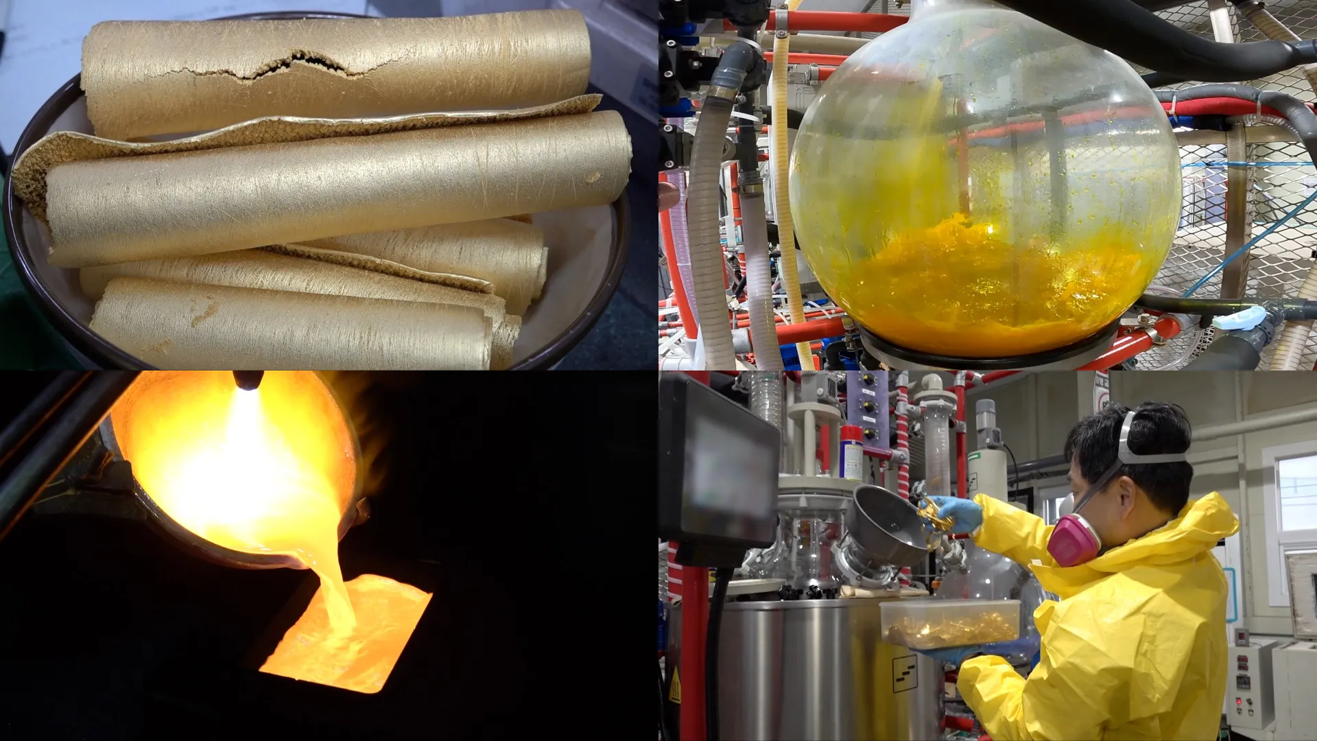 - 1단계 - 왕수(王水) 처리: 염산과 질산을 섞은 강력한 용액에 중고 금을 녹입니다. 이 과정에서 발생하는 유해 가스를 막기 위해 작업자들은 무거운 보호 장구를 갖추고 사투를 벌입니다.