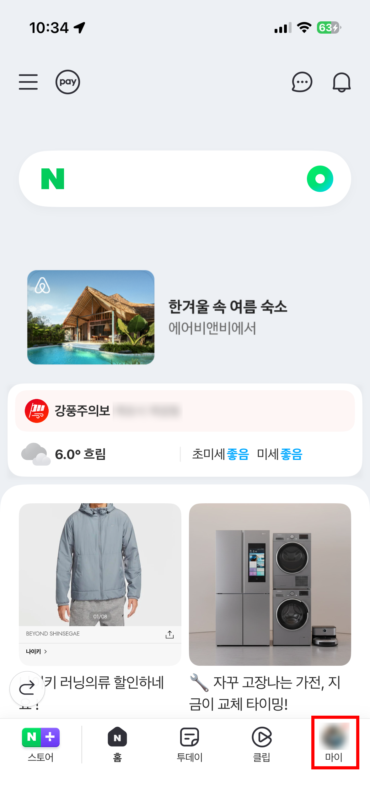 1. 기존 아이디로 로그인한 상태에서 오른쪽 하단의 '마이' 버튼을 클릭