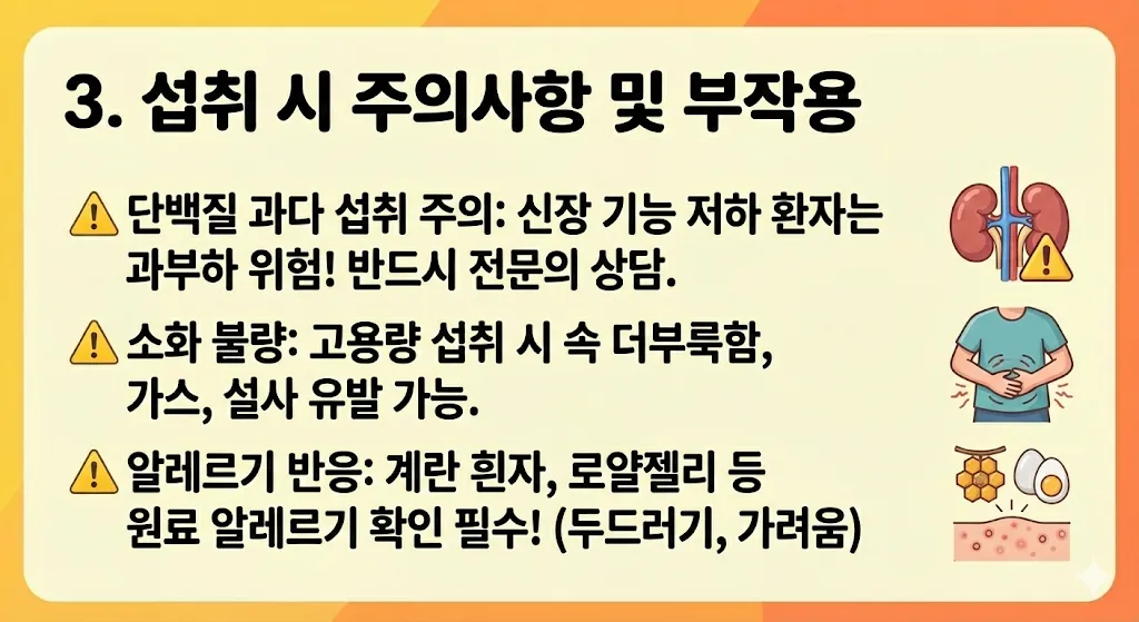 - 신장 과부하: 이미 신부전증이 있는 환자가 무분별하게 고함량 알부민을 섭취하면 단백질 대사 과정에서 신장에 무리가 갈 수 있습니다.