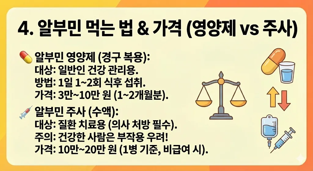 | 구분 | 알부민 영양제 (캡슐/정제) | 알부민 주사 (수액) |