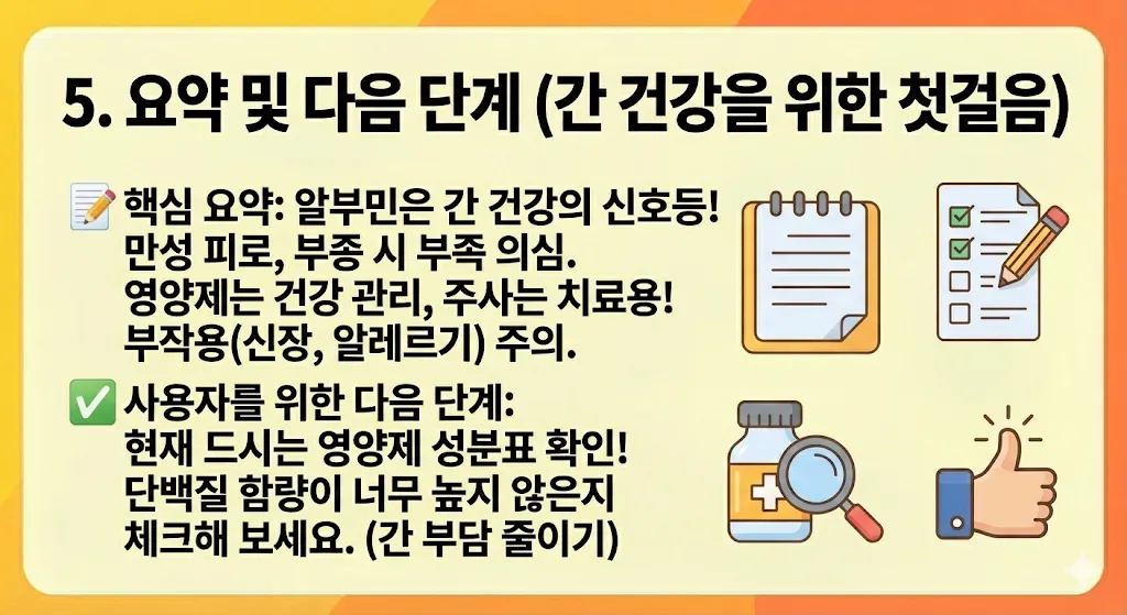 알부민은 간이 우리에게 보내는 중요한 건강 신호입니다. 평소 술을 자주 즐기거나 아침마다 몸이 무겁고 붓는다면, 알부민 영양제를 통한 꾸준한 관리나 병원 검진을 통한 수치 확인이 필요합니다. 자신의 몸 상태에 맞는 적절한 공급 방식을 선택하여 간 건강을 지키시길 바랍니다.