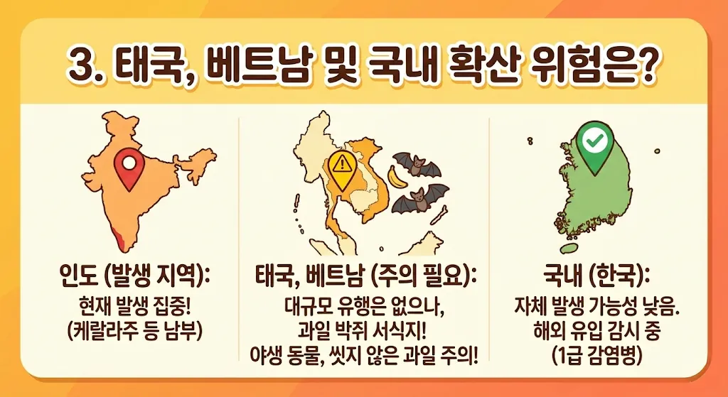 현재 대규모 유행은 인도에 국한되어 있으나, 니파바이러스를 옮기는 '과일 박쥐'는 동남아시아 전역에 서식합니다. 따라서 태국이나 베트남 여행 시 야생 동물 접촉을 피하고, 길거리에서 판매하는 씻지 않은 과일이나 야자 수액 섭취는 자제하는 것이 안전합니다.