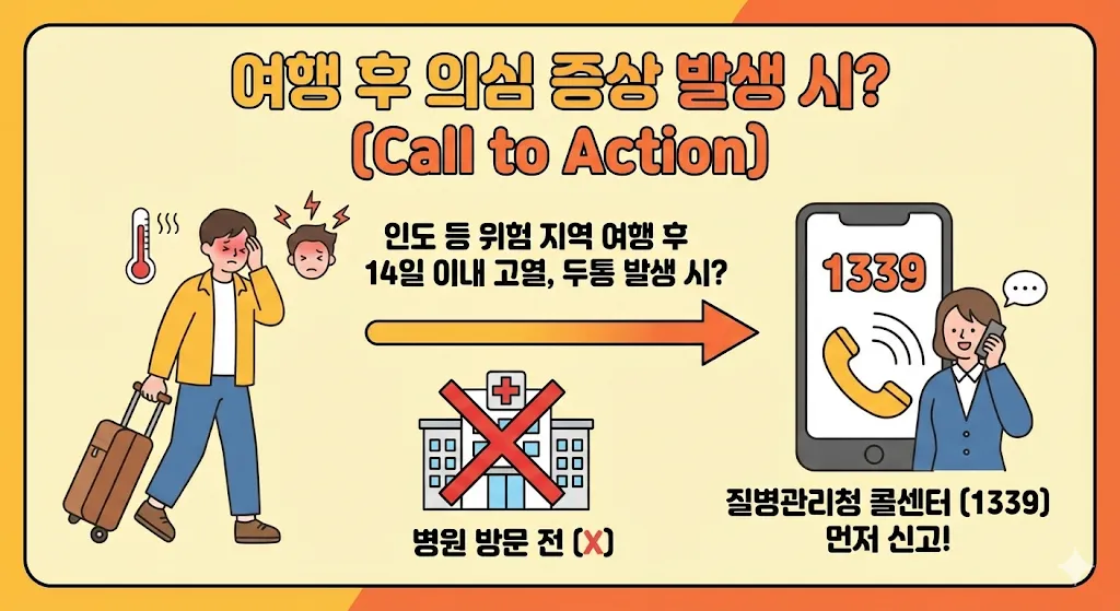 귀국 후 14일 이내 증상이 나타나면 병원을 직접 방문하지 말고, 먼저 질병관리청 콜센터(1339)에 신고하여 해외 여행력을 알리고 안내를 받아야 합니다.