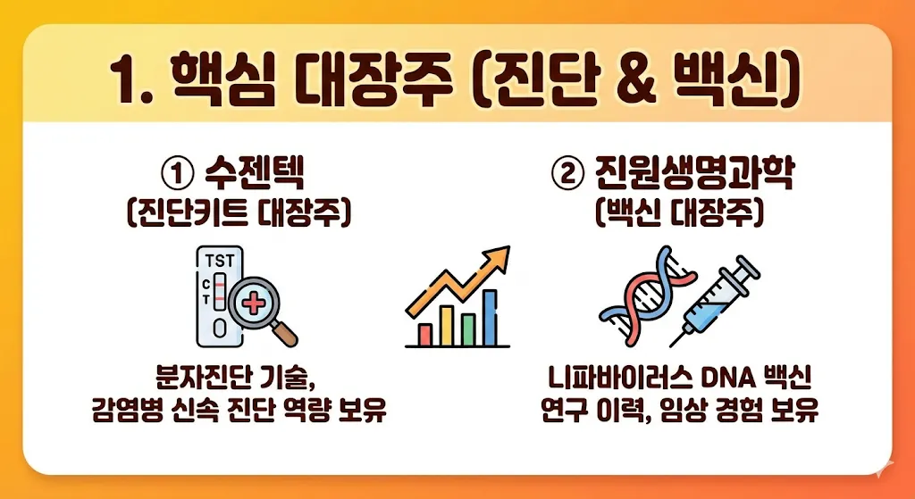 1. 시장을 주도하는 핵심 대장주 (진단 및 백신)