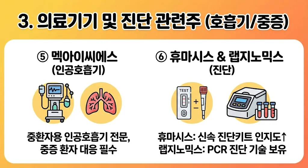감염 확산 시 필수적인 중환자용 장비와 현장 진단 수요를 담당하는 종목들입니다.