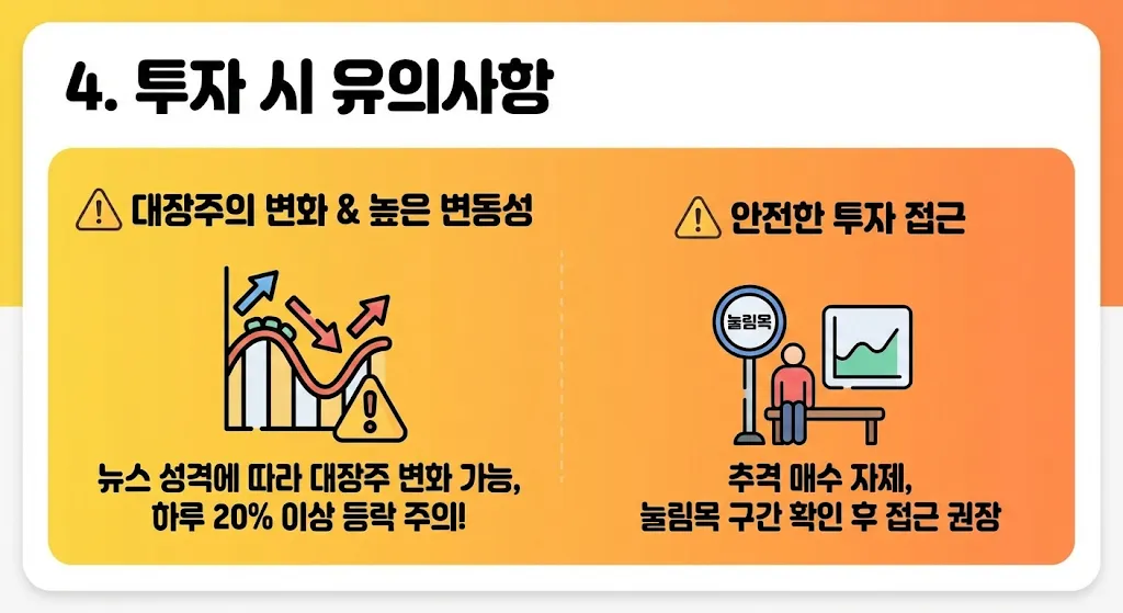 바이러스 테마주는 뉴스 하나에 주가 변동폭이 20~30%씩 발생할 만큼 변동성이 큽니다. 추격 매수보다는 확실한 지지선을 확인하는 전략이 필요하며, 실질적인 기술력이 없는 무늬만 테마주인 종목은 피해야 합니다.